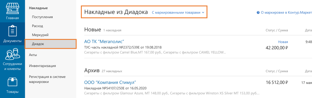 - Оптовик поставляет магазину маркированные сигареты и немаркированные спички, жвачку, снеки, хлебцы, шоколад. Все эти товары указаны в одном УПД, отправленном через Контур.Диадок. Магазин в Маркете получает этот УПД и может сразу принять все товары по единому документу.